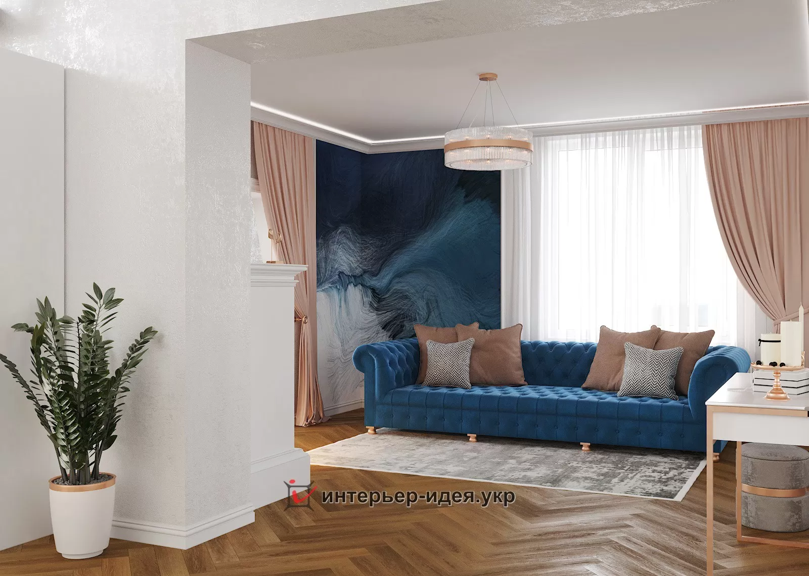 Главная цель дизайна - создание гармоничного размещение всех деталей в проходной гостиной.