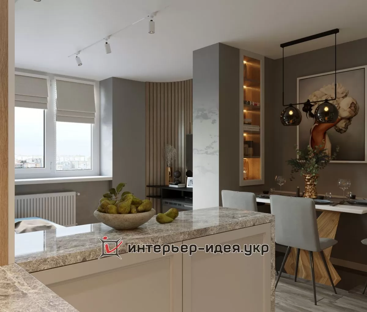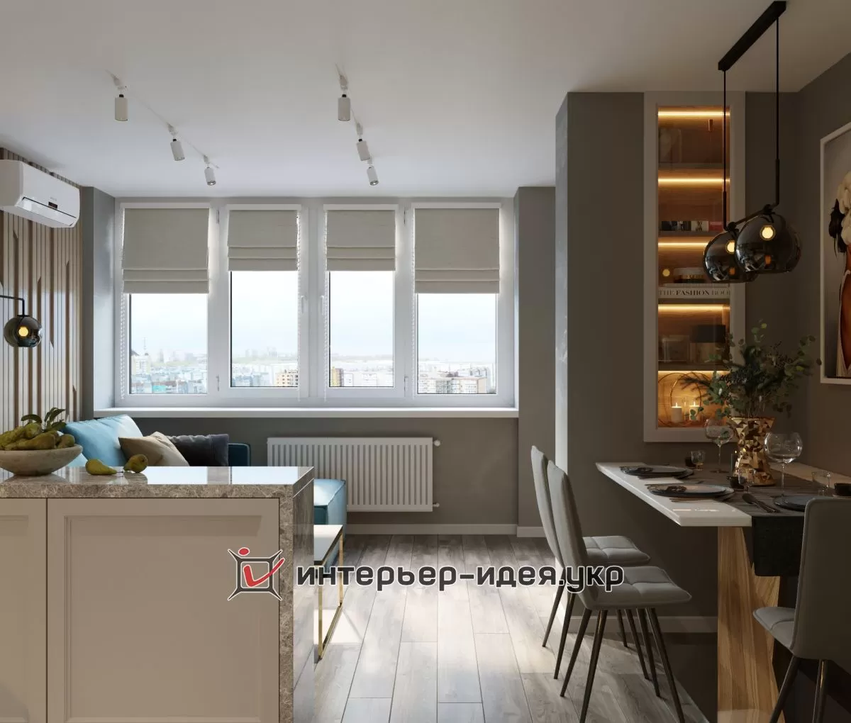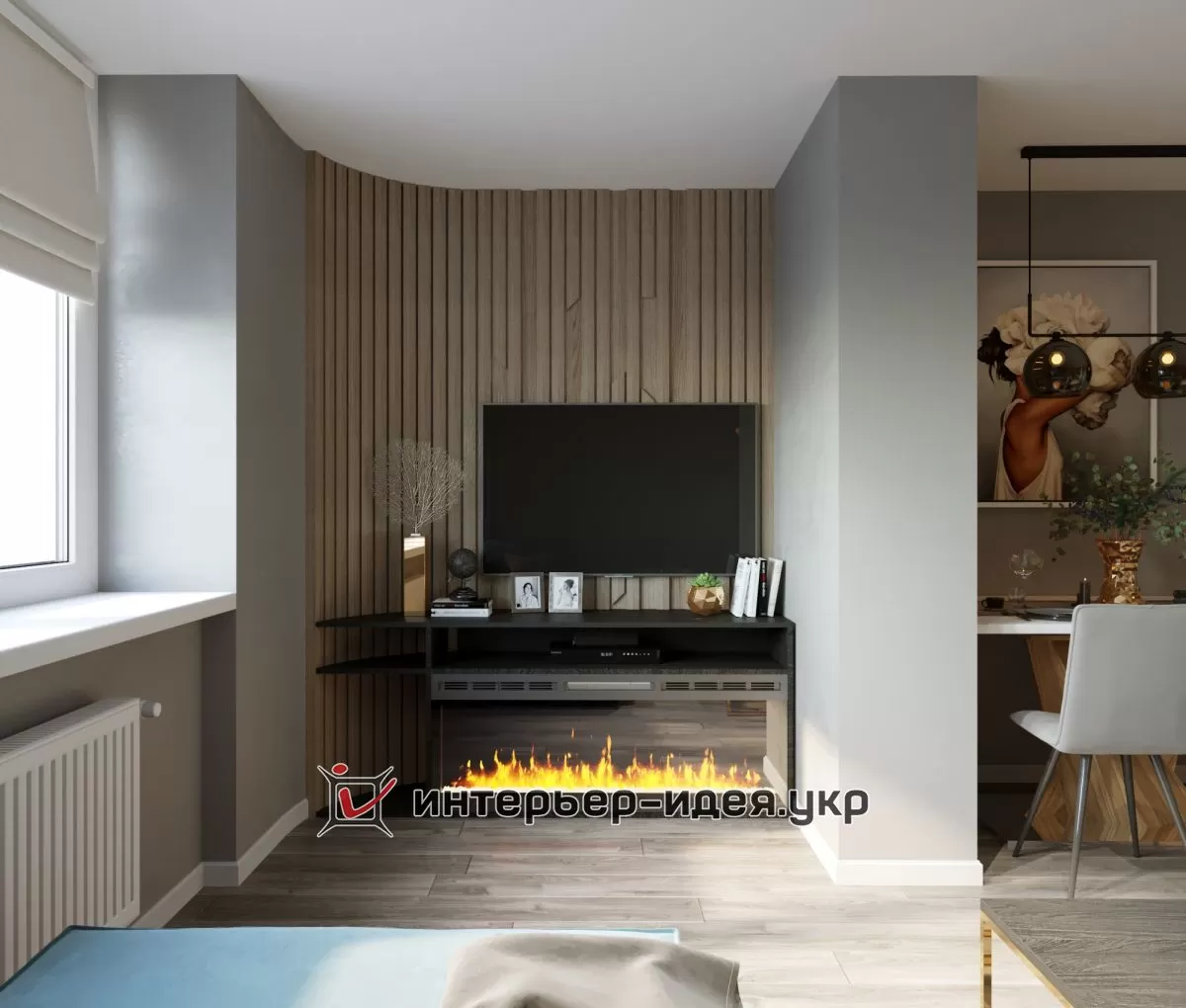 На небольшом пространстве кухни студии – 25,70 кв. метров расположить такие функциональные зоны: кухонная зона, зона отдыха с электрокамином, а так же разместить обеденную зону.