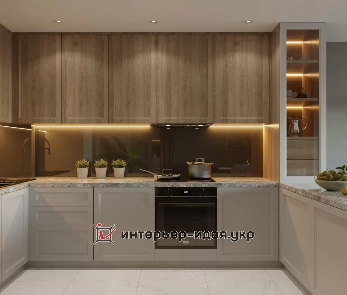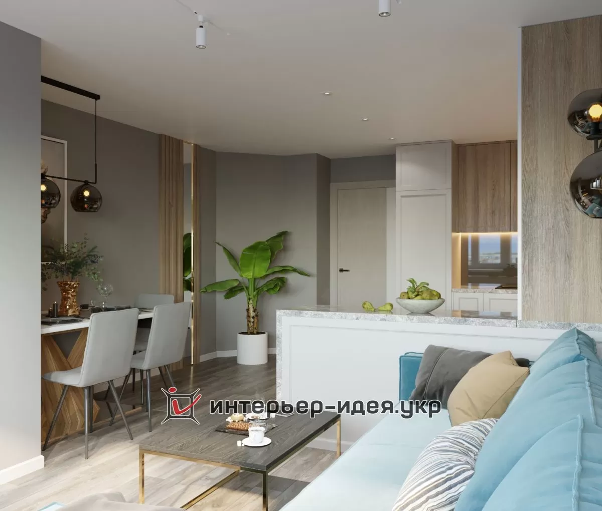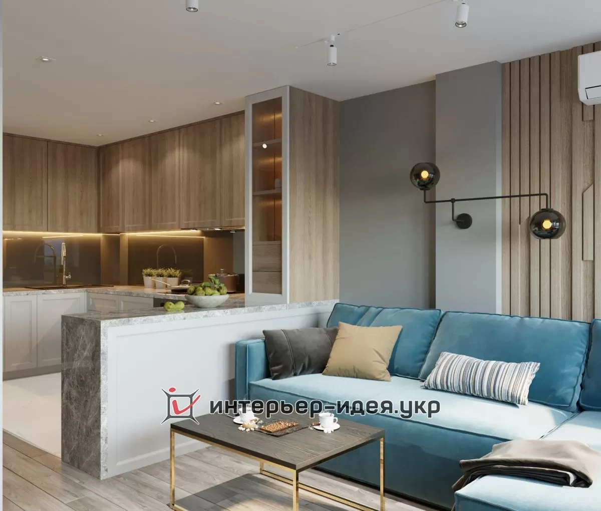 На небольшом пространстве кухни студии – 25,70 кв. метров расположить такие функциональные зоны: кухонная зона, зона отдыха с электрокамином, а так же разместить обеденную зону.