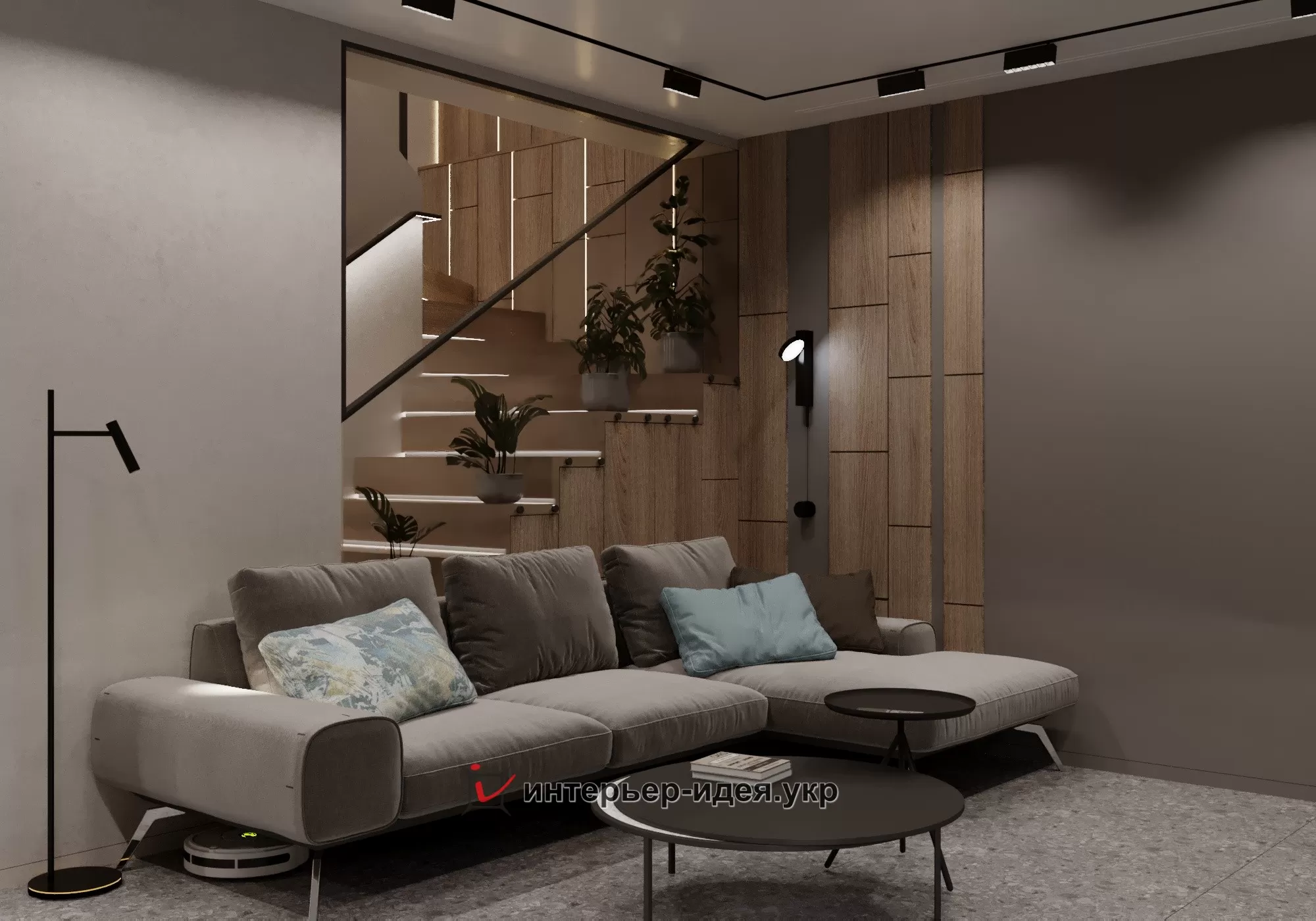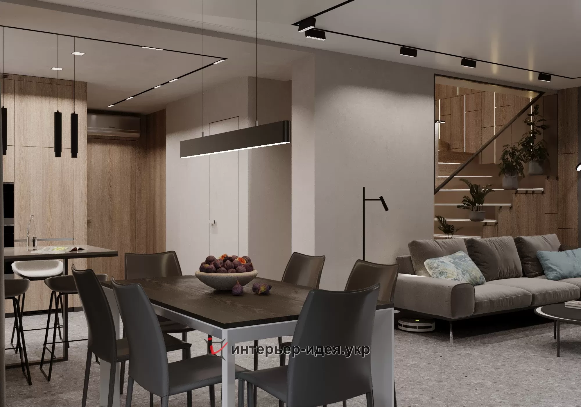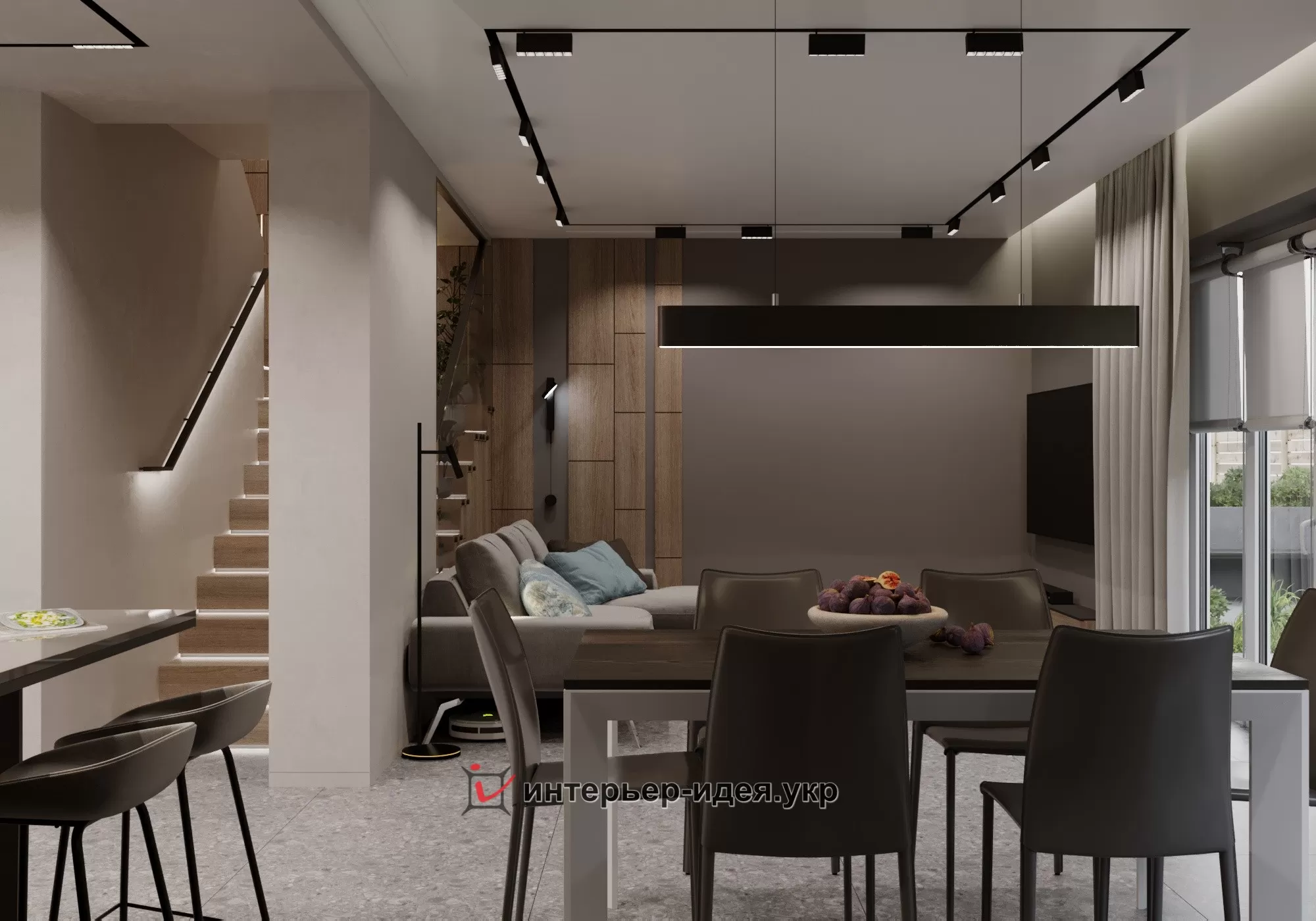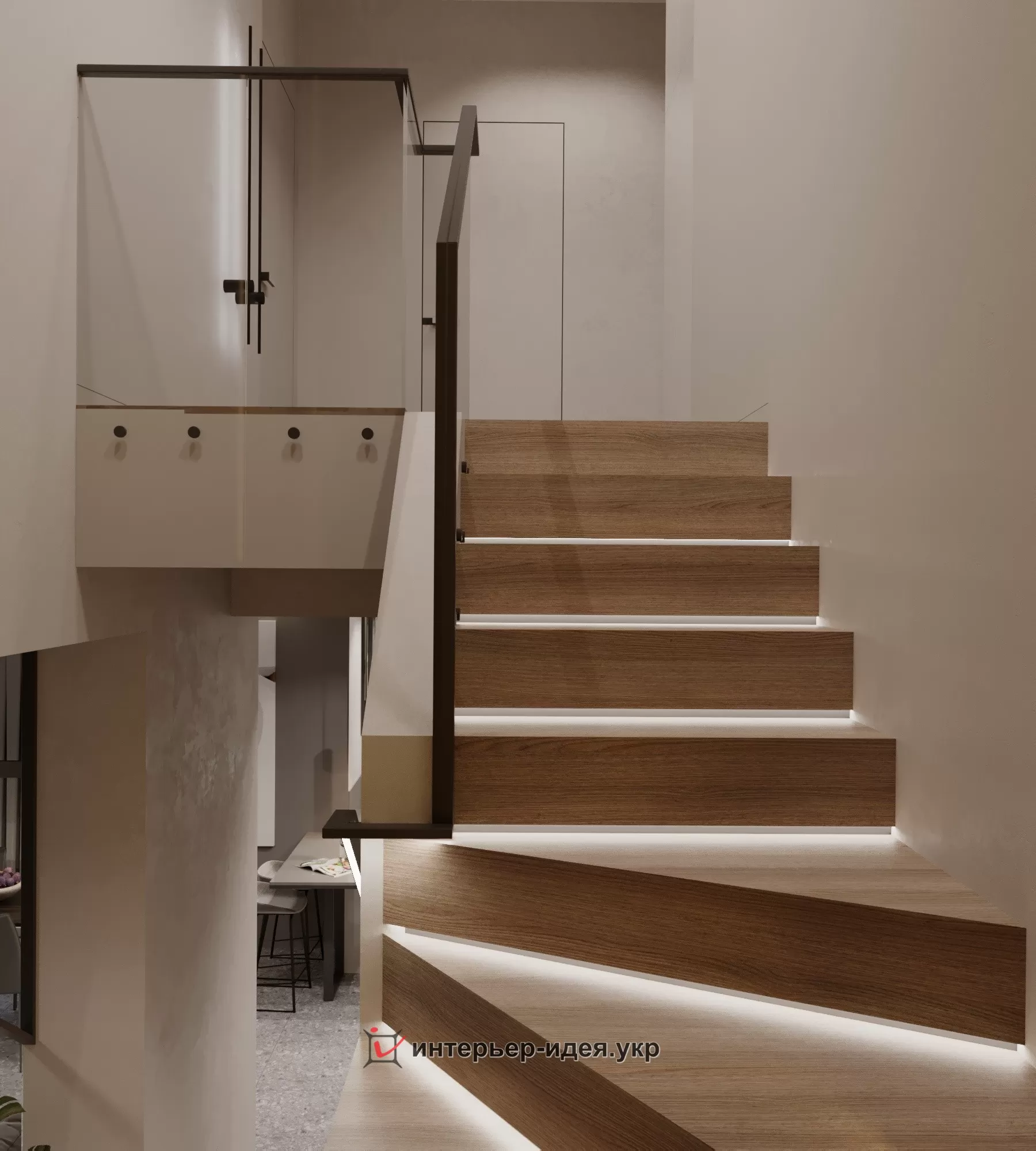 Она светла и воздушна, интересно объединяется с гостиной стеклянной перегородкой и как бы зазывает в зону 2-го этажа. Место под лестницей также функционально.