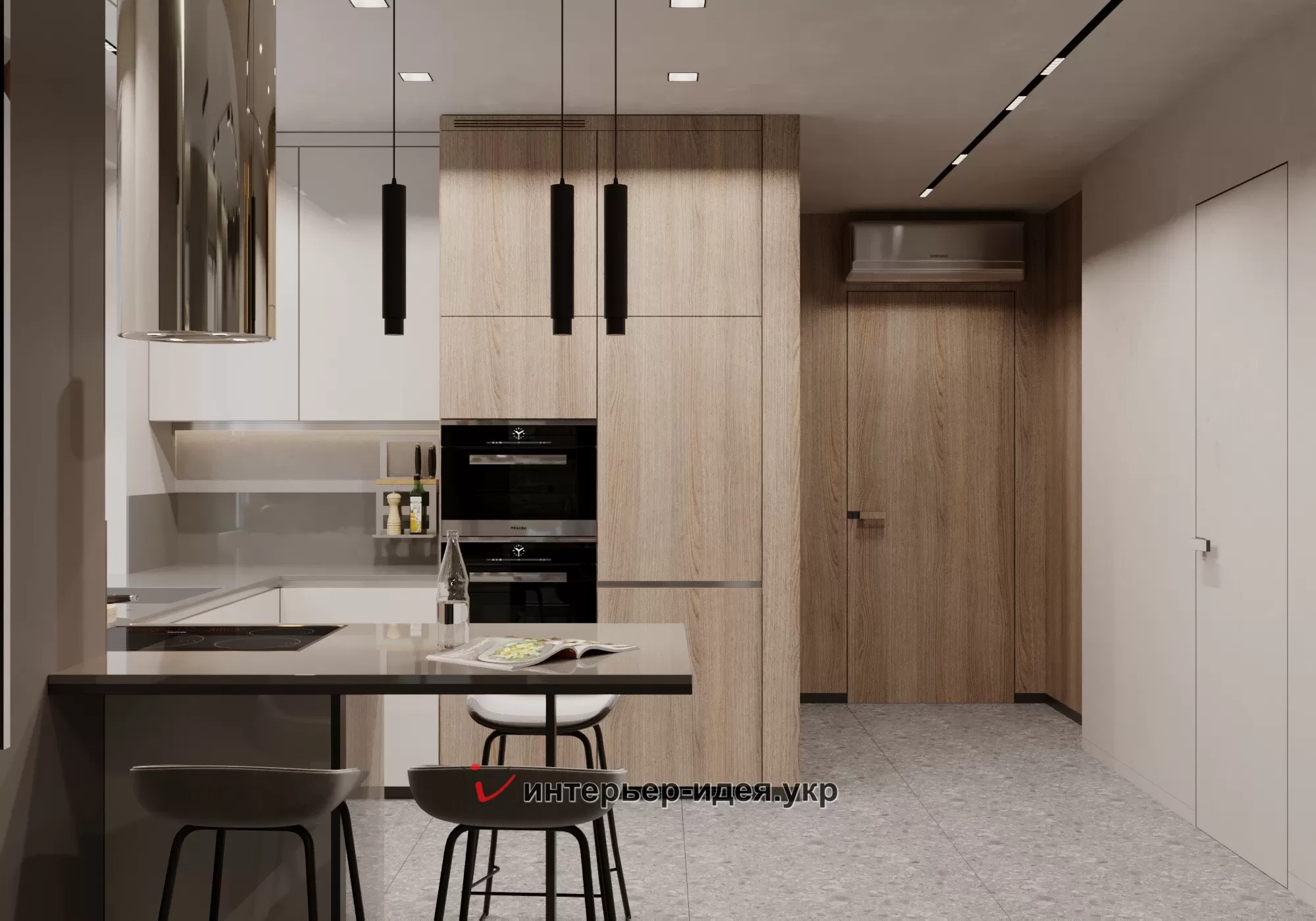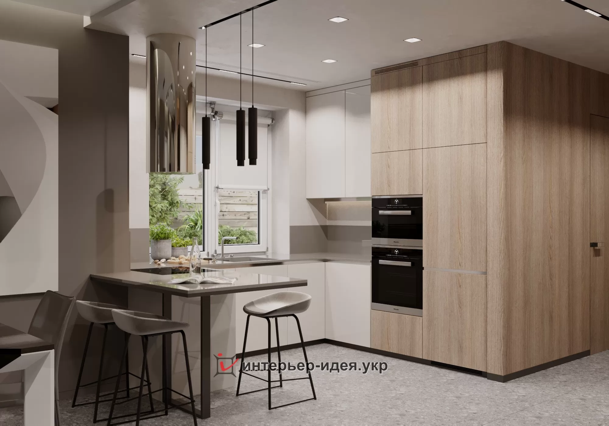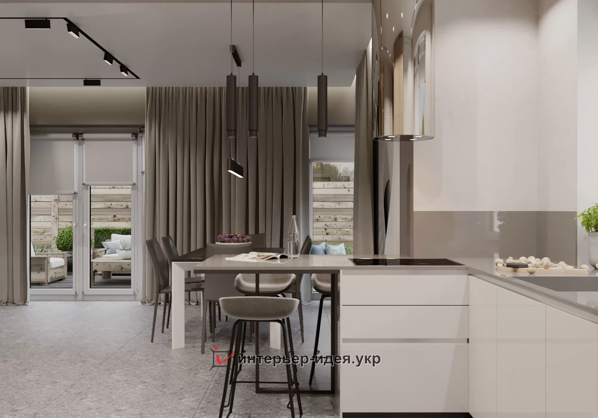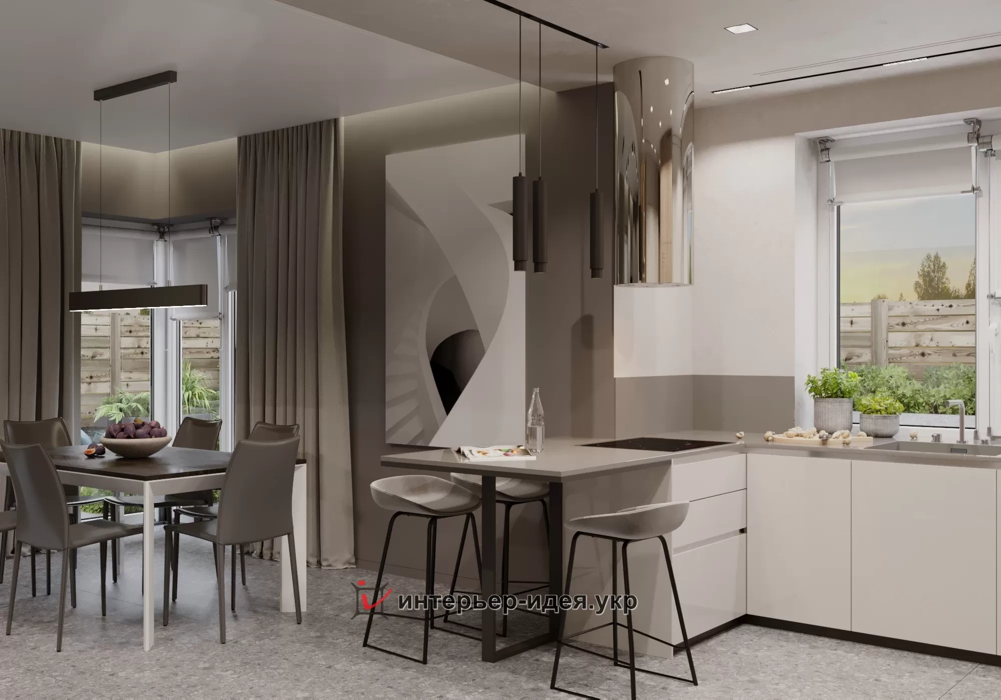 Она светла и воздушна, интересно объединяется с гостиной стеклянной перегородкой и как бы зазывает в зону 2-го этажа. Место под лестницей также функционально.