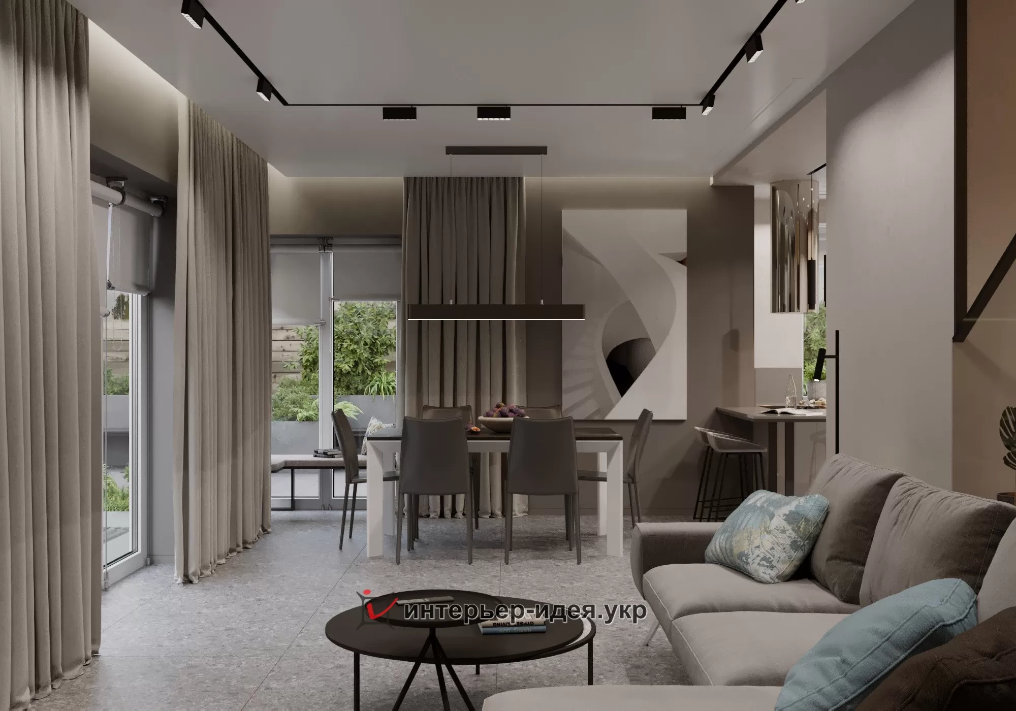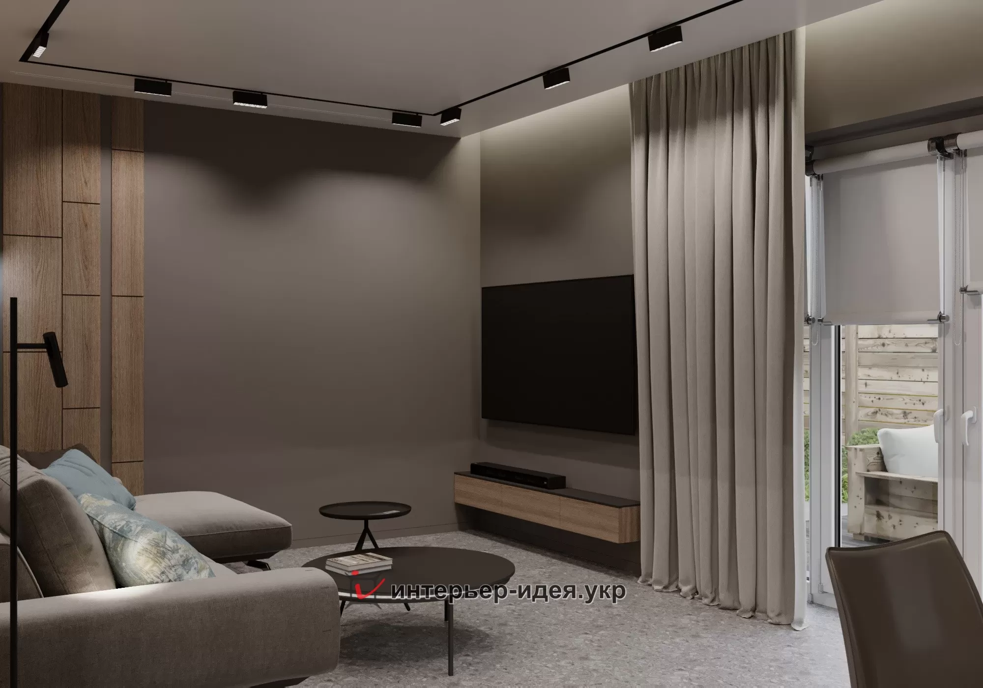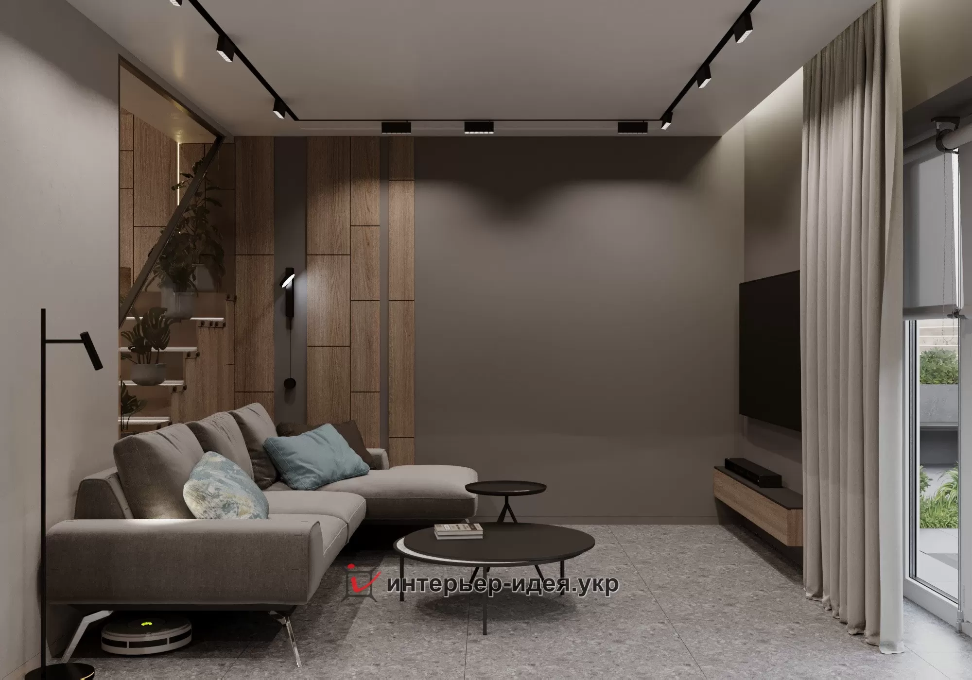 Так как в гостиной много окон и они выходят на солнечную сторону, цветовое решение данной зоны более темное и приглушенное.