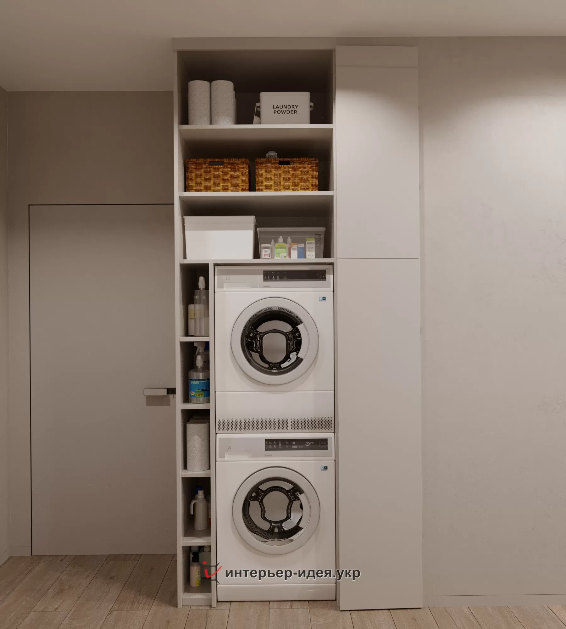 В холле второго этажа, дабы освободить место в ванной, мы оборудовали мини прачечную.