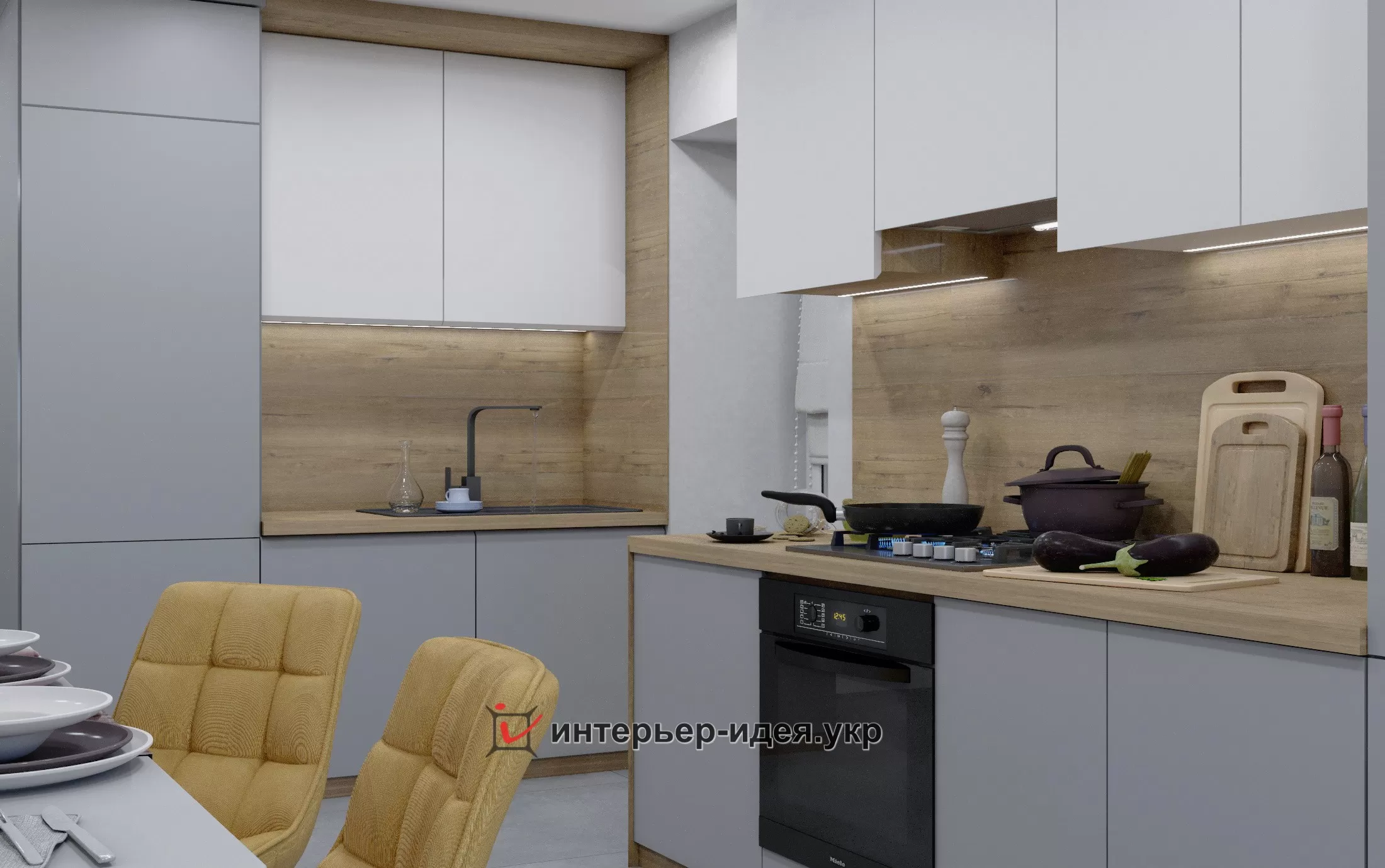 Кухонный фартук и столешница выполнены в одном материале, объединяющем рабочую зону, и выглядит одним целым.