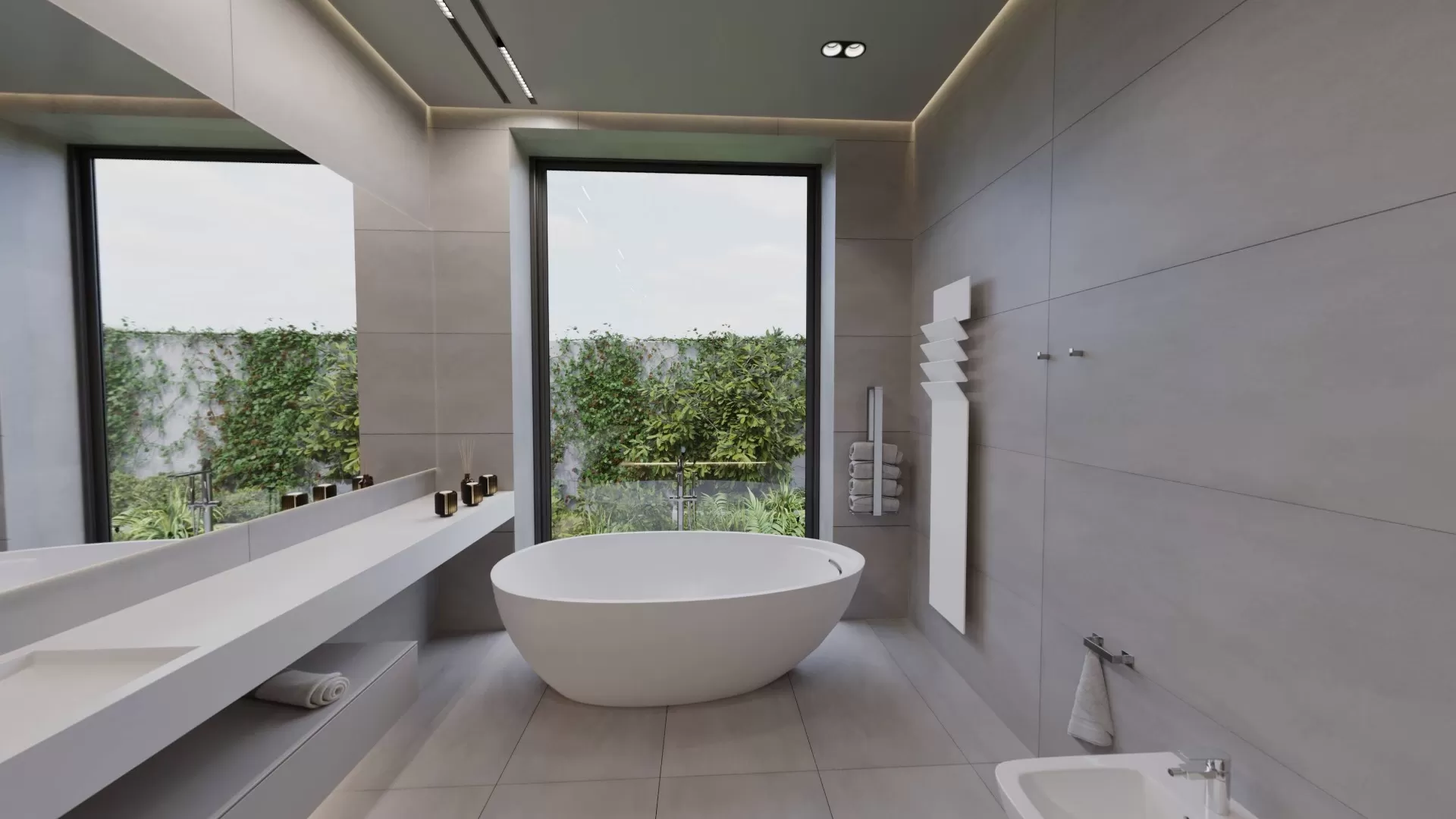 Все эти элементы проходят одной линией через всю комнату и соединяют между собой зону тропического душа и отдельно стоящую ванну.
