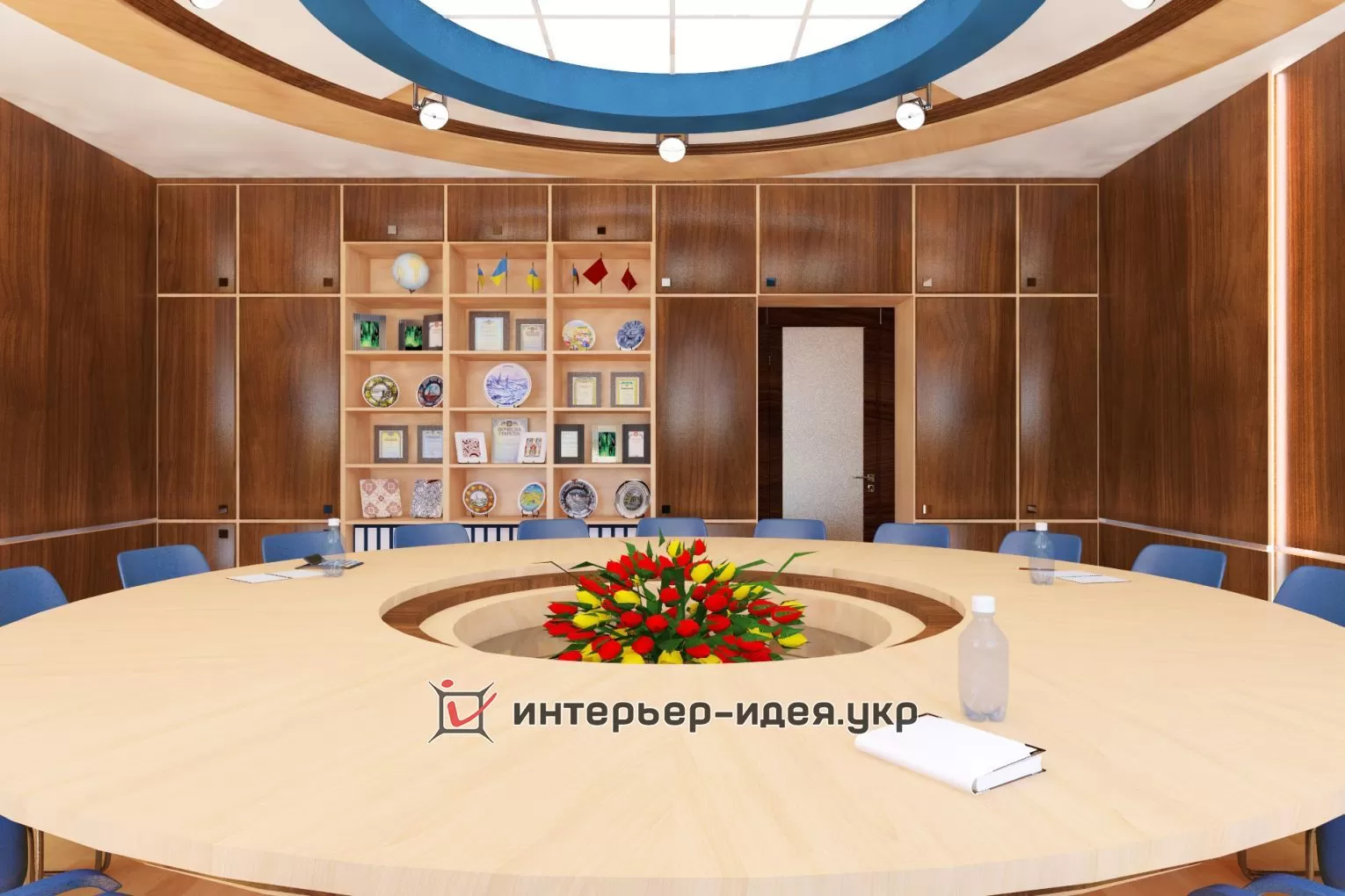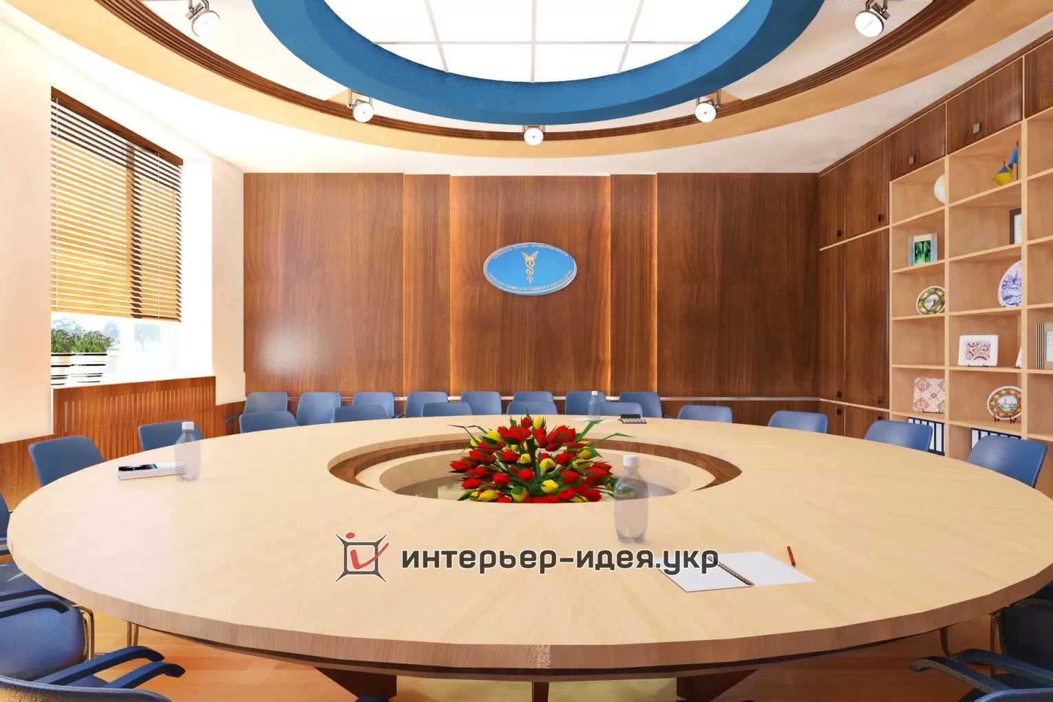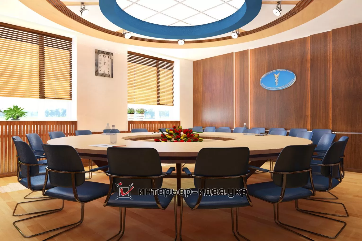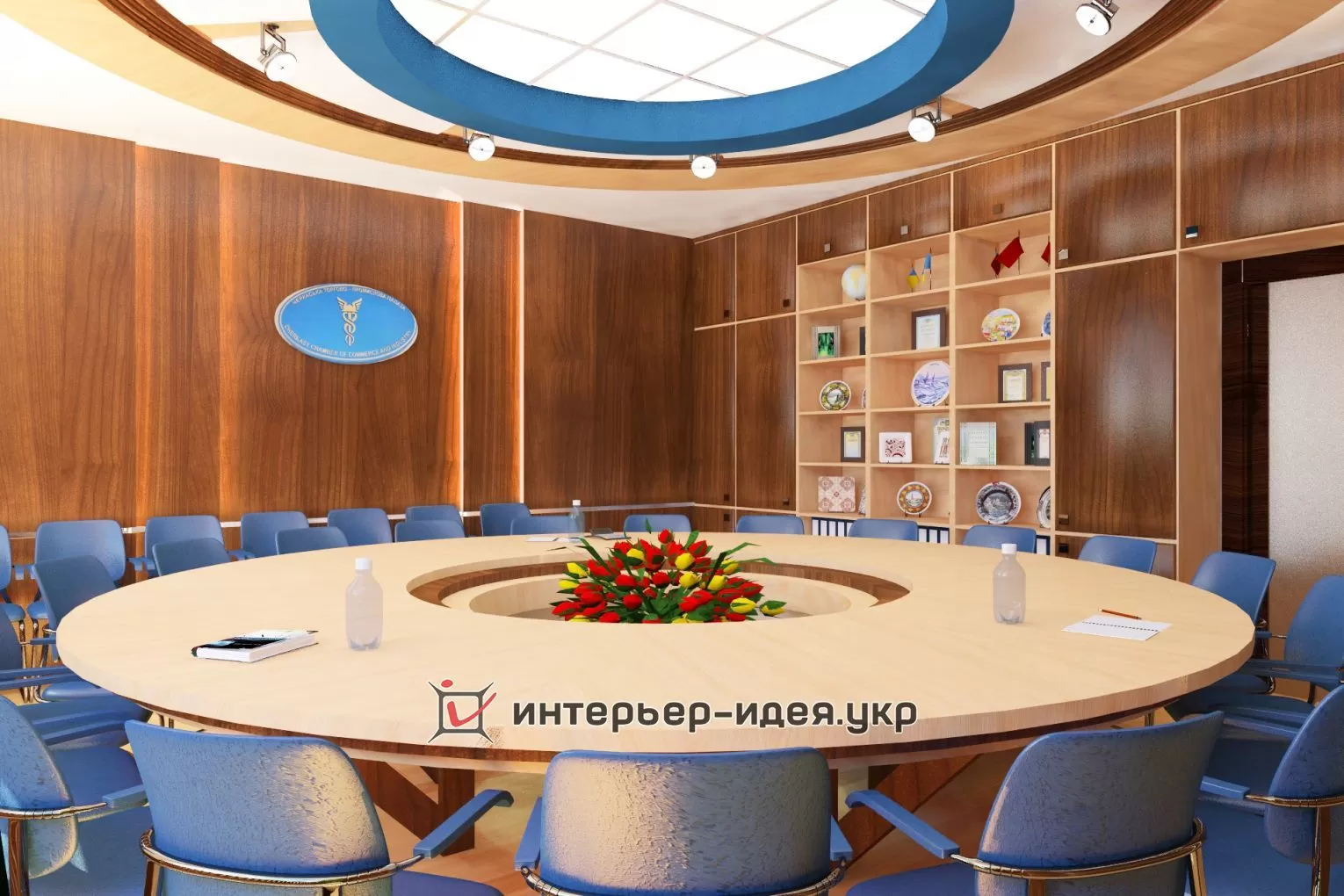 В поддержку голубому овальному логотипу компании, применена кожаная обивка стульев светло-синего цвета.