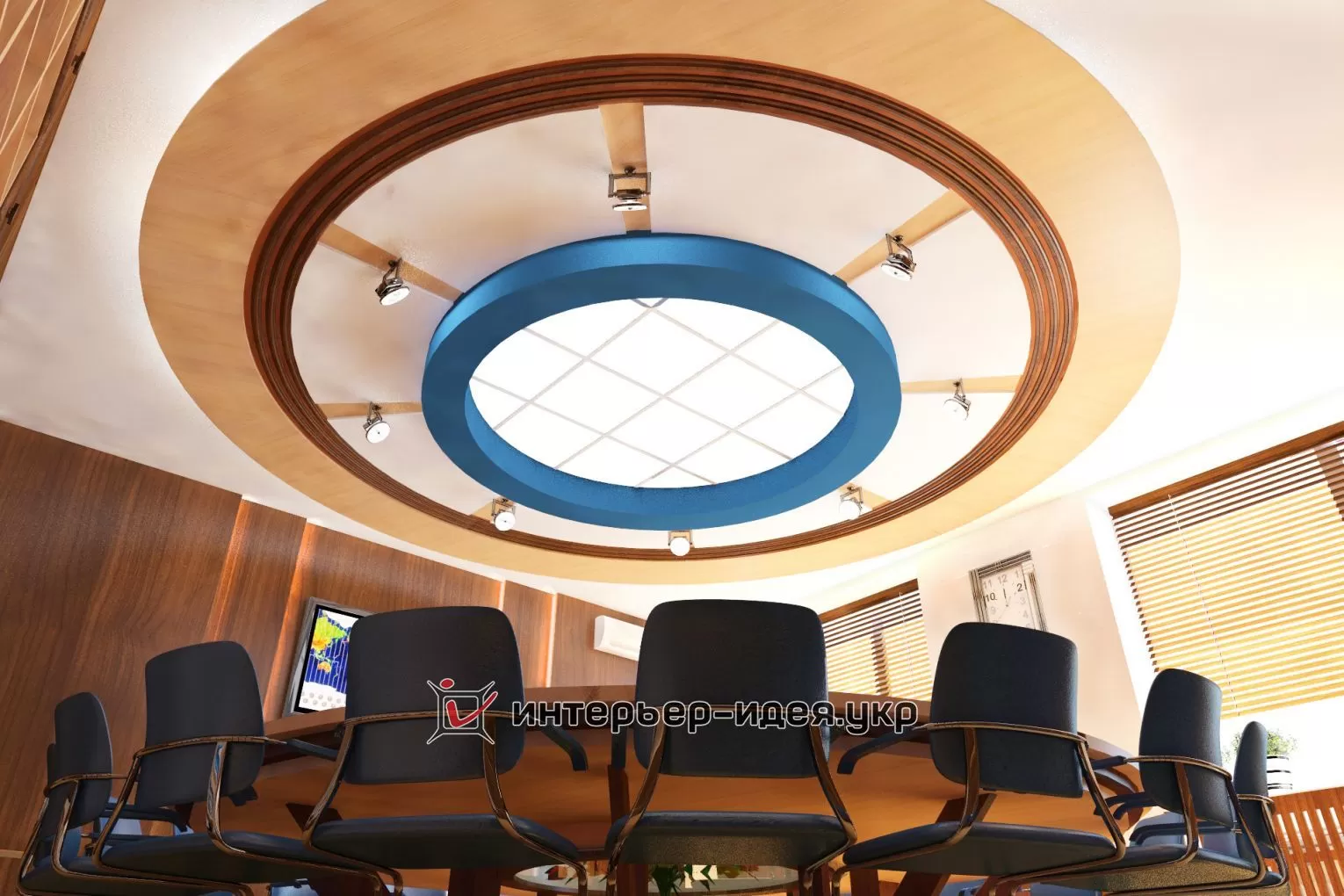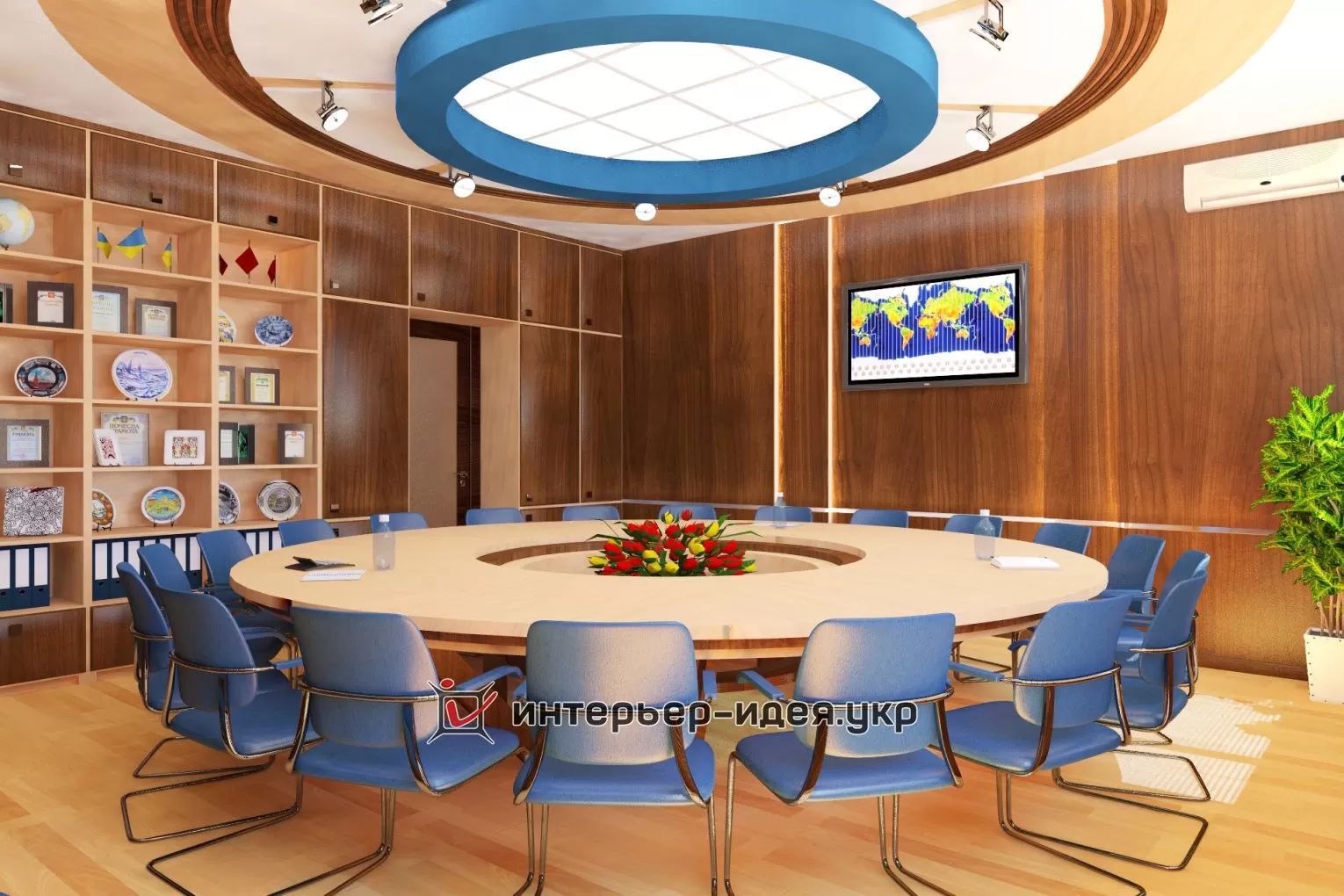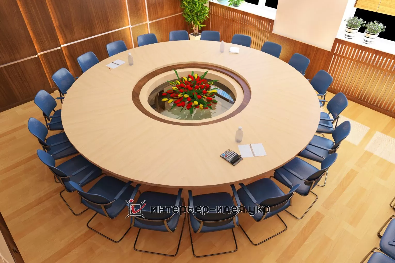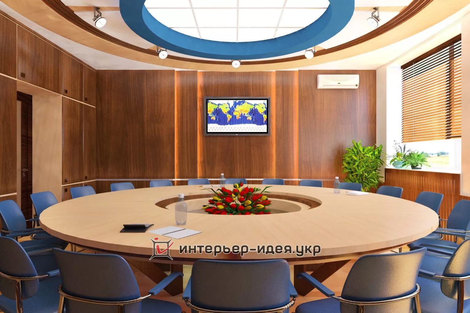 В поддержку голубому овальному логотипу компании, применена кожаная обивка стульев светло-синего цвета.