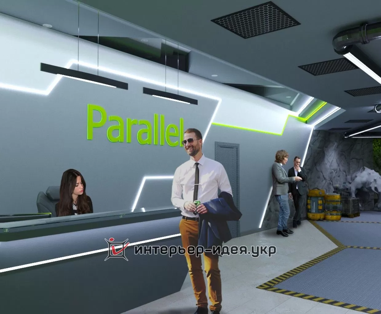 Потолок: покраска в серый цвет, декорирование вентиляционными решетками и металлическими трубами со встроенной подсветкой;