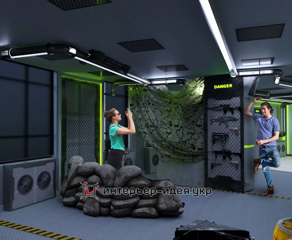 Разместили так называемые "окопы" и стену с оружием, там же можно раскидать гильзы и пустые коробки от патронов; там можно как бы спрятаться от зомби, разбросать мешки, пару бутафорных автоматов или учебных гранат...